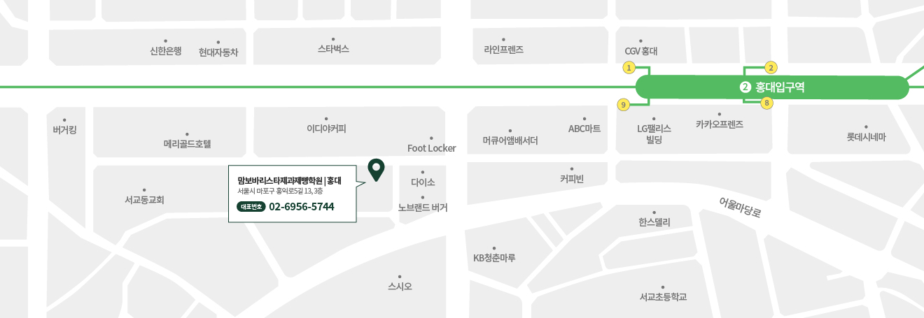 2호선 홍대입구역 9번출구에서 도보 5분 거리에 위치하고 있습니다.