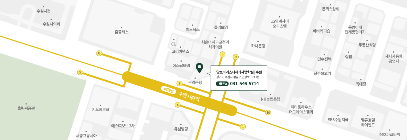 수인분당선 수원시청역 7번, 8번출구 바로 연결되는 건물에 위치하고 있습니다.