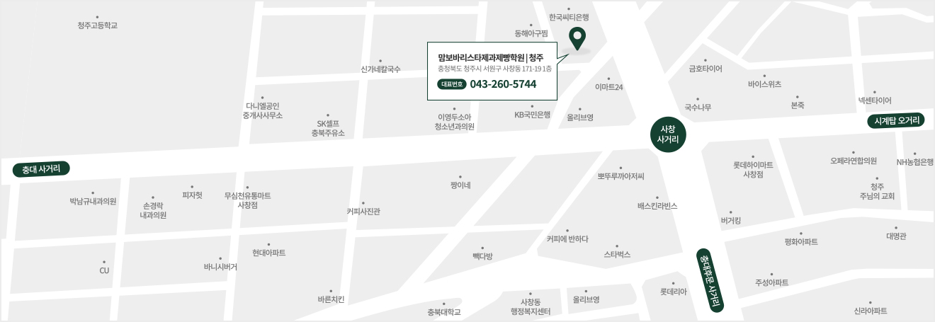 사창사거리, 충북대 인근 도보 5분 거리에 위치하고 있습니다.